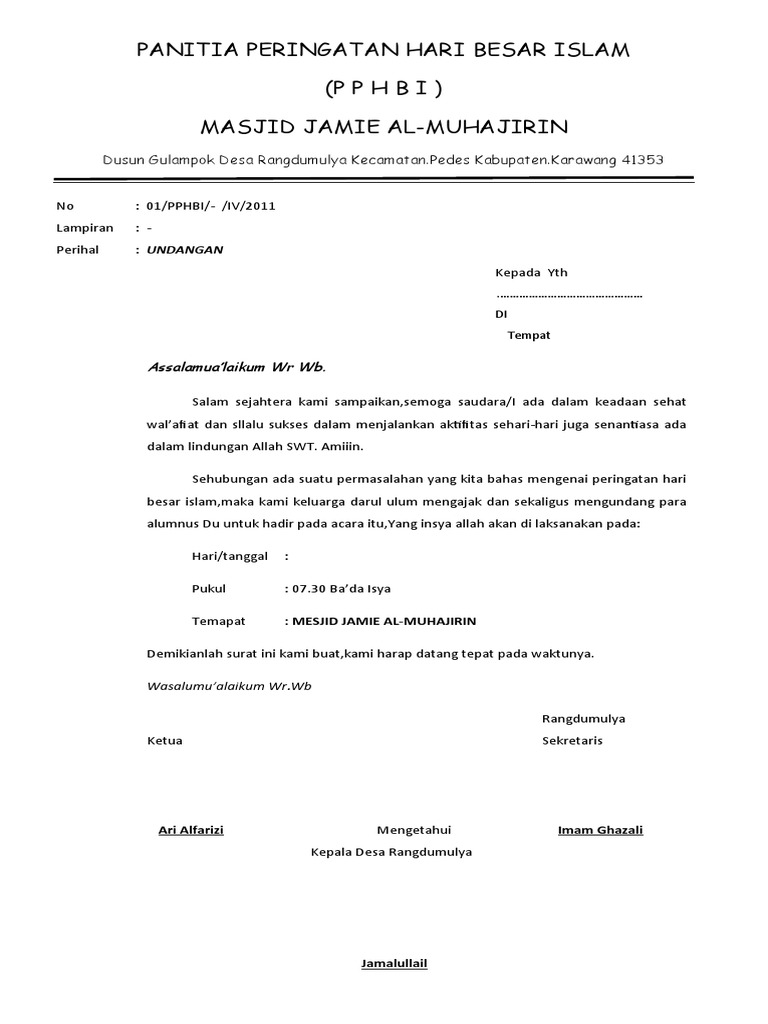 Contoh Surat Undangan Rapat Rt Bahasa Sunda Audit Kinerja from imgv2-2-f.scribdassets.com Contoh surat undangan maulid nabi. Surat undangan terbagi menjadi dua macam yaitu surat undangan resmi dan surat undangan non resmi. Surat rekomendasi untuk mendapatkan sertifikasi guru. Surat undangan alumni merupakan surat resmi yang dikeluarkan oleh suatu lembaga/instansi yang ditujukan kepada para alumni lembaga terkait dalam rangka meminta kehadiran dalam suatu acara ataupun kegiatan. Contoh surat pribadi bahasa inggris untuk teman dekat contoh surat pribadi untuk sahabat terbaru lengkap contoh surat mungkin hanya itu saja pembahasan informasi tentang contoh surat undangan acara peringatan maulid nabi yang bisa kami berikan kepada anda semua. Contoh surat undangan seminar terbaru. Beberapa diantaranya adalah surat undangan pengajian akbar, pengajian rutin, pengajian pernikahan, pengajian maulid nabi, pengajian umum, pengajian syukuran, dan lain. Surat pengantar dari kepala desa adalah surat yang dikeluarkan oleh kepala desa dan ditujukan kepada seseorang atau pejabat yang berfungsi untuk penggunaan surat pengantar bukanlah hal yang baru di desa.