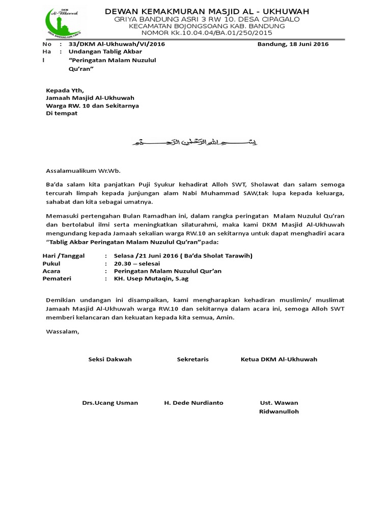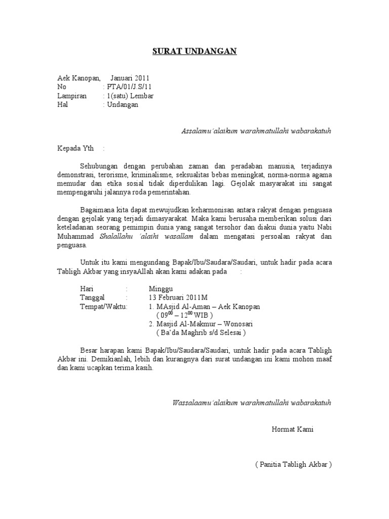 Download contoh surat undangan tidak resmi.doc. Surat undangan adalah surat yang dibuat dengan tujuan mengajak seseorang atau pihak lain untuk menghadiri sebuah acara tertentu. Laporan kas keuangan takmir 2013. Contoh surat undangan rapat warga dilingkup rt dan rw. Demikian undangan ini kami sampaikan , atas perhatian dan kehadirannya kami haturkan terima kasih dan semoga allah meridhoi kita, aamiiin.