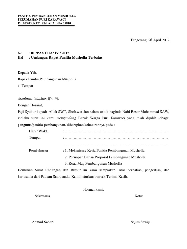 Daftar contoh surat undangan rapat resmi sepertia pada kesempatan sebelumnya, dikesempatan ini kami juga akan membahas. Pembuatan surat undangan sangatlah diperlukan apabila sebuah lembaga maupun organisasi ingin mengundang beberapa orang penting untuk bisa. Smp negeri 7 kebumen alamat : Documents similar to undangan rapat masjid. Contoh surat bisnis, surat dinas, surat izin, surat kuasa, surat lamaran kerja, surat pemberitahuan, surat penawaran, surat pengunduran diri, surat peringatan, surat perjanjian, surat pernyataan, surat resmi, surat undangan. Semoga contoh surat undangan rapat ini bisa menjadi referensi dan bermanfaat dalam anda membuat surat dalam tanggung jawab anda mungkin karena sebagai sekretaris rt atau yang lainnya. Anda sudah tahu bagaimana cara membuat sebuah undangan yang baik dan benar. Contoh sk takmir masjid doc guru ilmu sosial struktur kepengurusan surat keputusan kepala desa tentang pengangkatan permohonan latihan gabungan pramuka sabilurrasyad: Jika anda mencarinya, anda bisa mencari undangan takmir masjid doc di internet. Maka dari itu kami selaku panitia sekaligus takmir masjid al huda sukosari mengundang segenap jama'ah untuk dapat menhadiri pengajian umum tersebut. Dan tentunya jangan lupa untuk membawa surat undangan rapat takmir masjid. Di kesempatan kali ini dosenpintar.com akan membagikan artikel mengenai tentang contoh surat undangan yang meliputi. Nah berikut ini jatikom akan berikan contoh surat rapat yang baik dan benar.